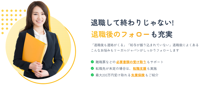 リーガルジャパンでは、退職の意思を伝えるだけでなく退職後のサポートも万全なんです!